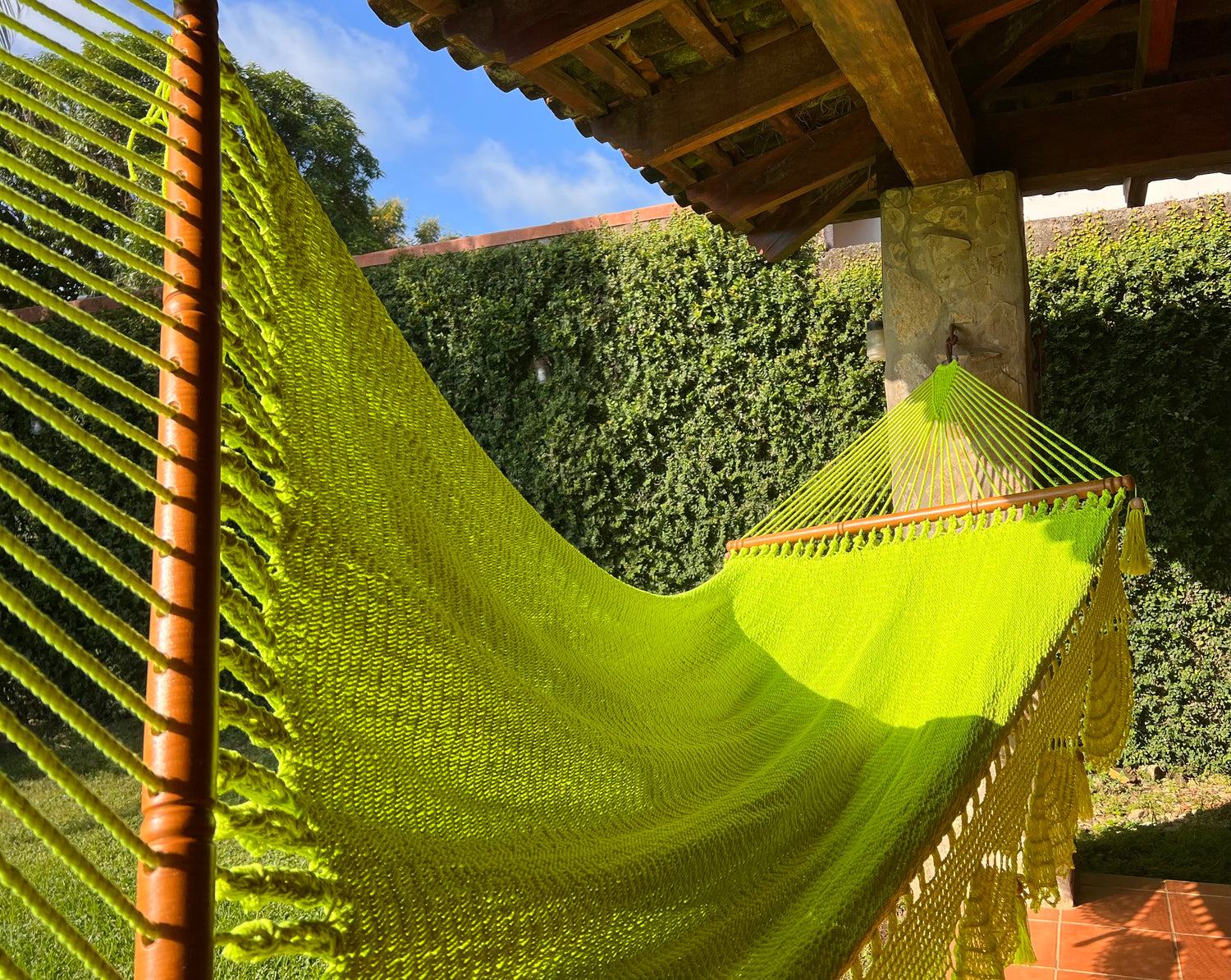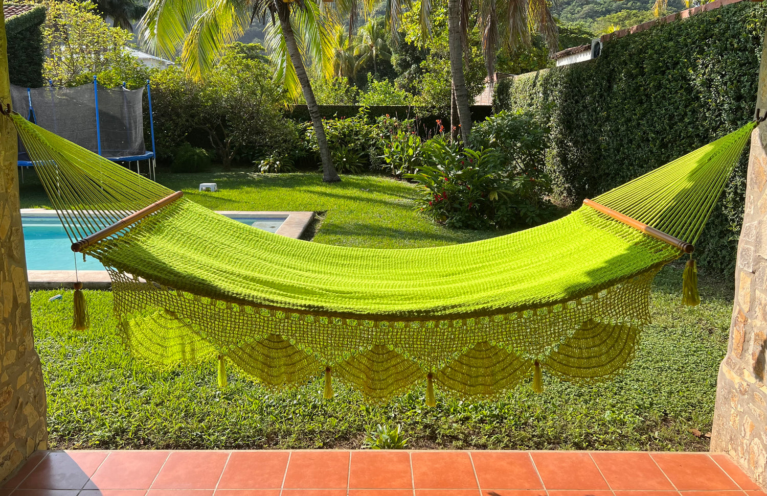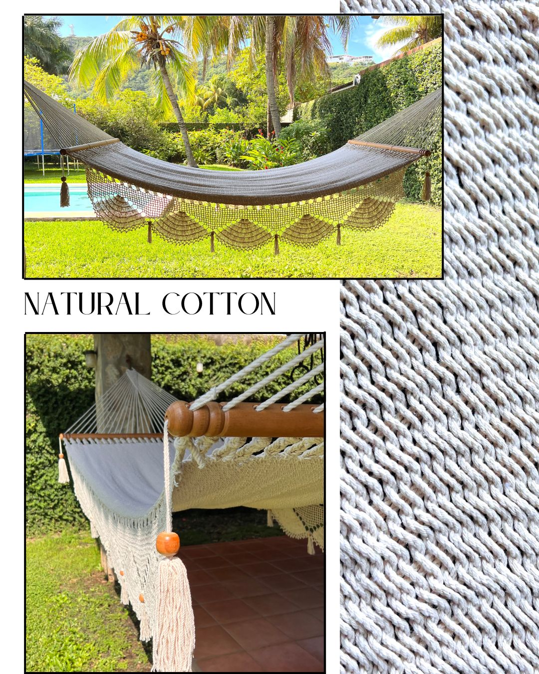All of our cotton queen hammocks are handmade in Nicaragua with 100% cotton. Each queen size hammock takes approximately 22h and miles of soft cotton to make. The hand-woven cotton will soften through time, giving the perfect stretch, while the wooden spreader keeps the hammock spread out and allows the hammock to follow your contour just right.