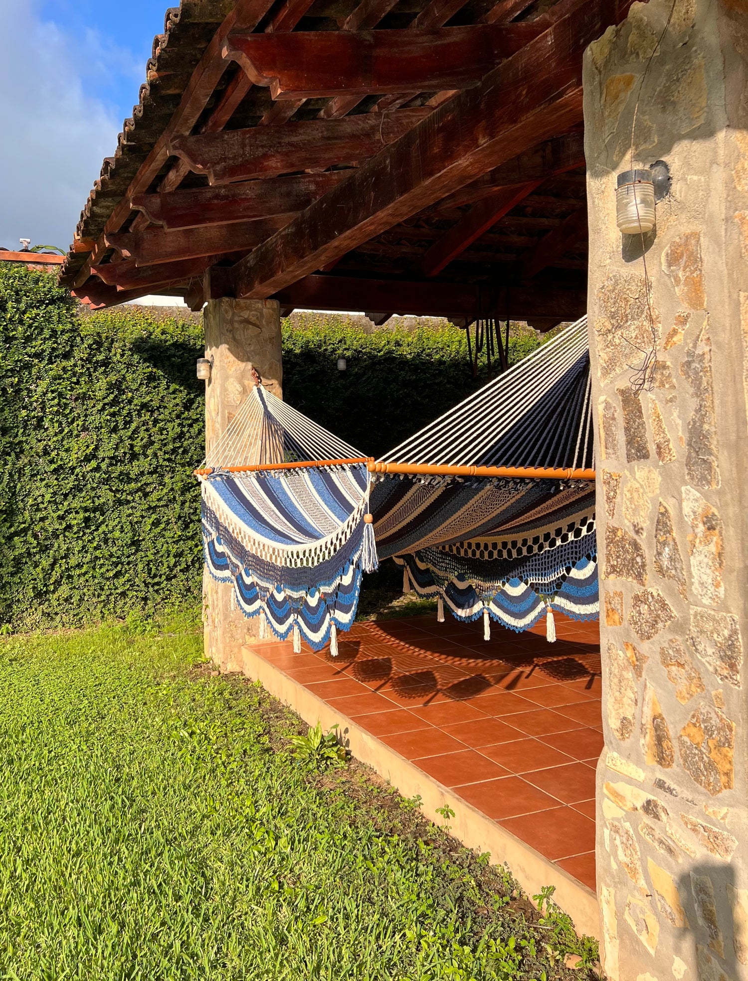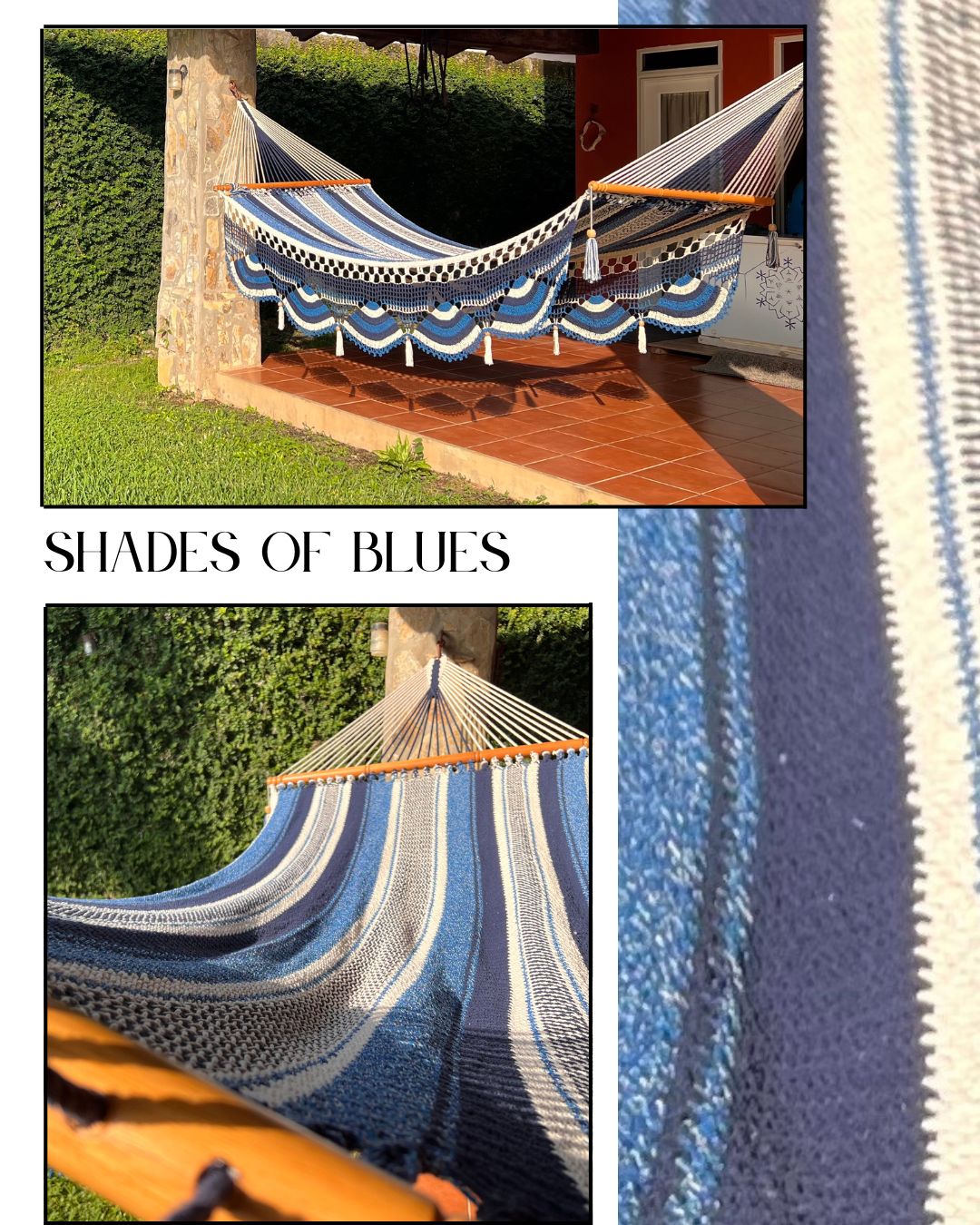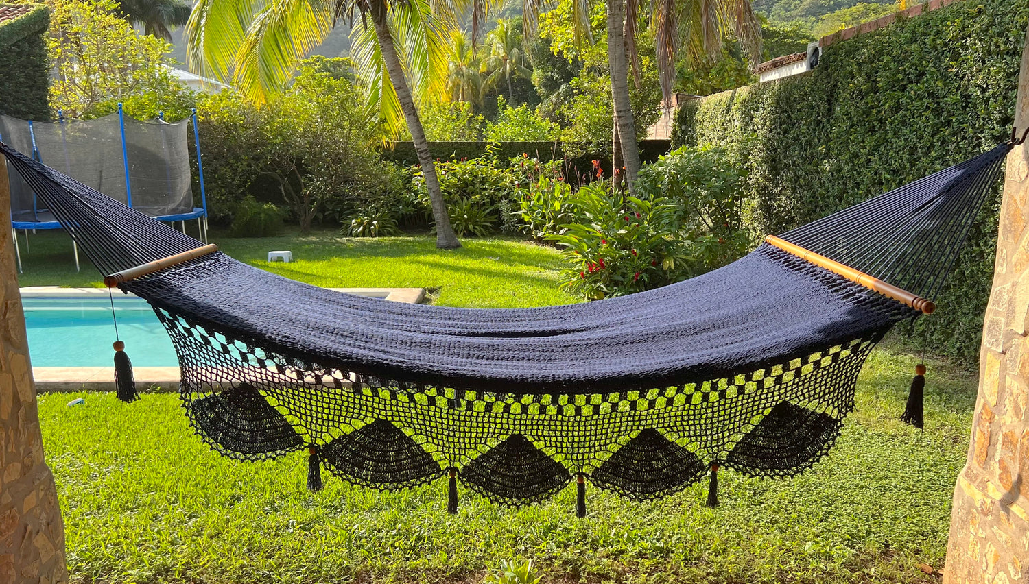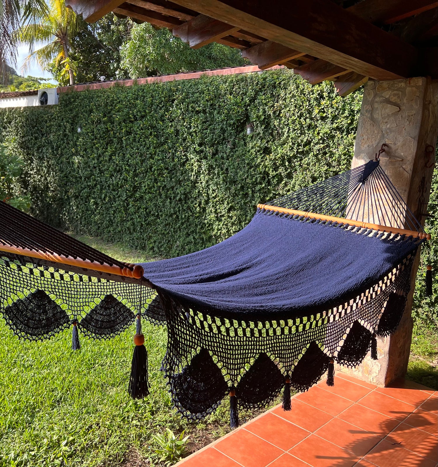 All of our cotton queen hammocks are handmade in Nicaragua with 100% cotton. Each queen size hammock takes approximately 22h and miles of soft cotton to make. The hand-woven cotton will soften through time, giving the perfect stretch, while the wooden spreader keeps the hammock spread out and allows the hammock to follow your contour just right.